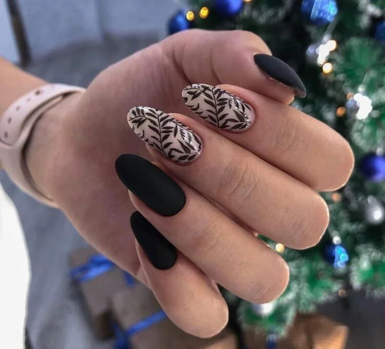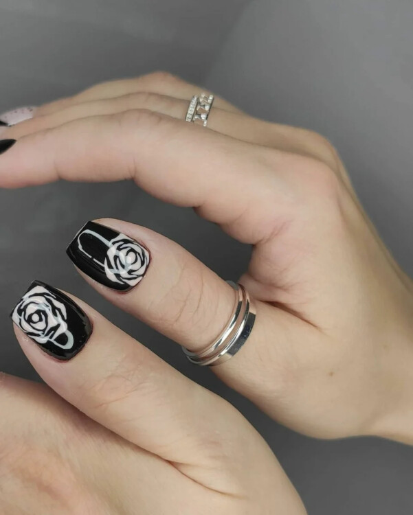 Тематичні весняні малюнки також прекрасна ідея для нового сезону. У парі з чорним лаком найцікавіше виглядатимуть білі квіти, наприклад, троянди, тюльпани або просто гілочки рослин і листя. Розміщувати візерунок краще на одному, максимум двох нігтях, щоб не перевантажити дизайн. Адже як ми вже не раз писали, в 2021 році цінується мінімалізм.