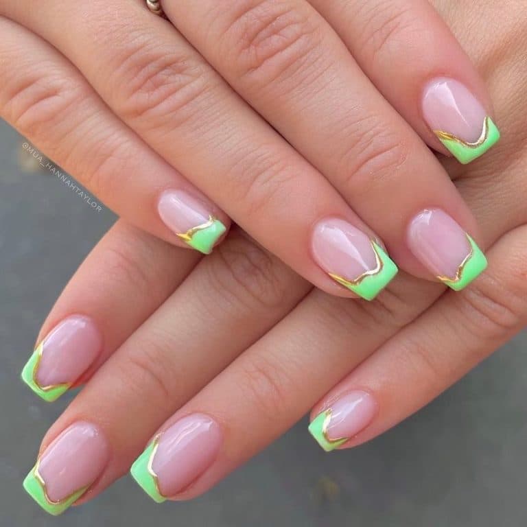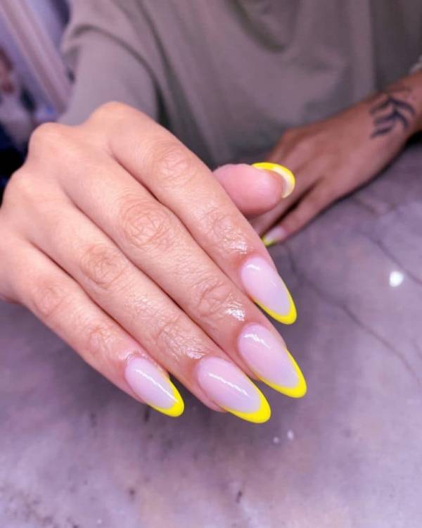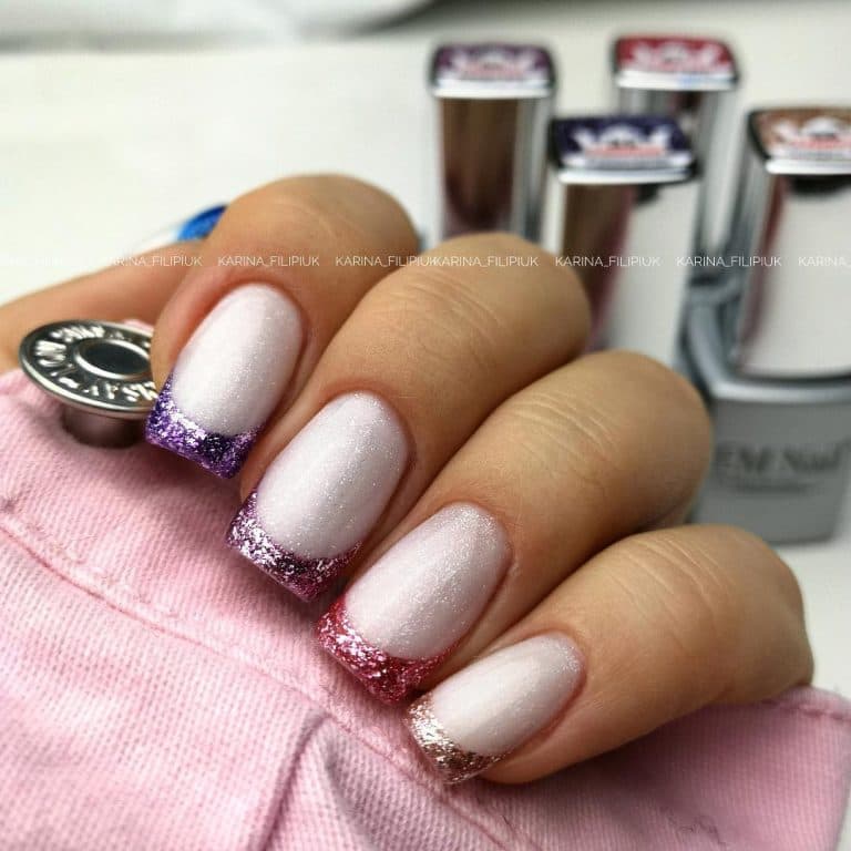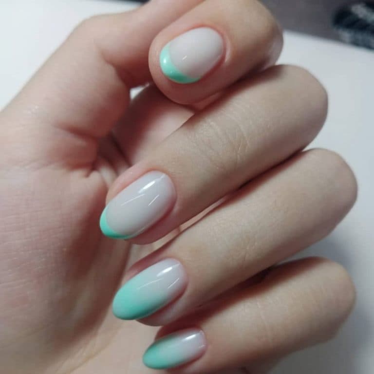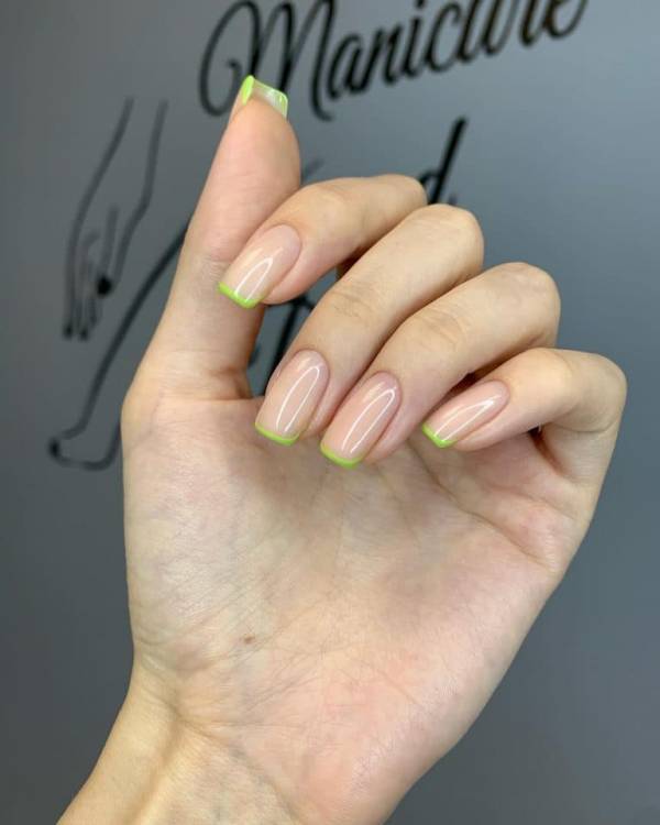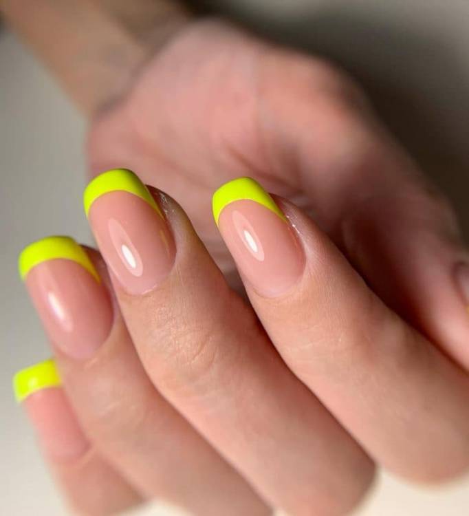 Ще один популярний варіант френча на нігтях, який все частіше миготить у соц. мережах. Його зробити дуже легко – достатньо пофарбувати край нігтя лаком улюбленого кольору. Найкраще це робити за допомогою трафаретів для французького манікюру. Наймодніші відтінки: зелений, жовтий, оранжевий, яскраво-рожевий, блакитний та бузковий.