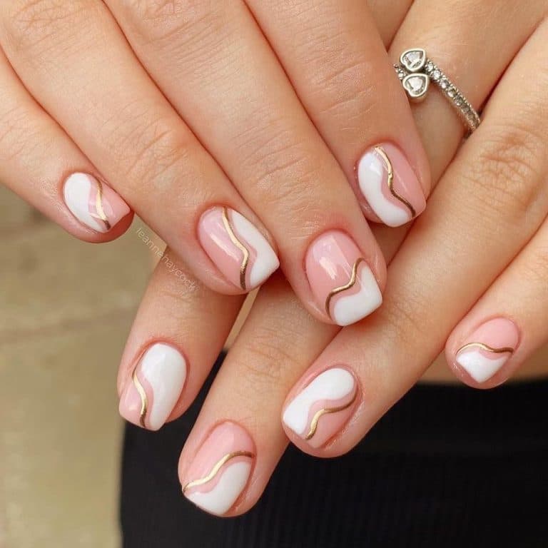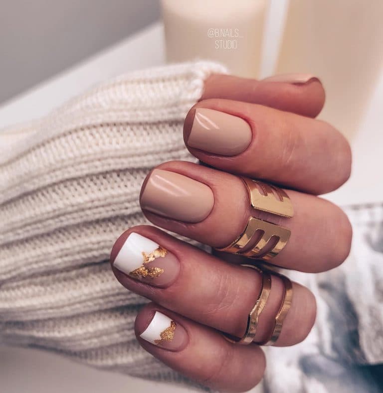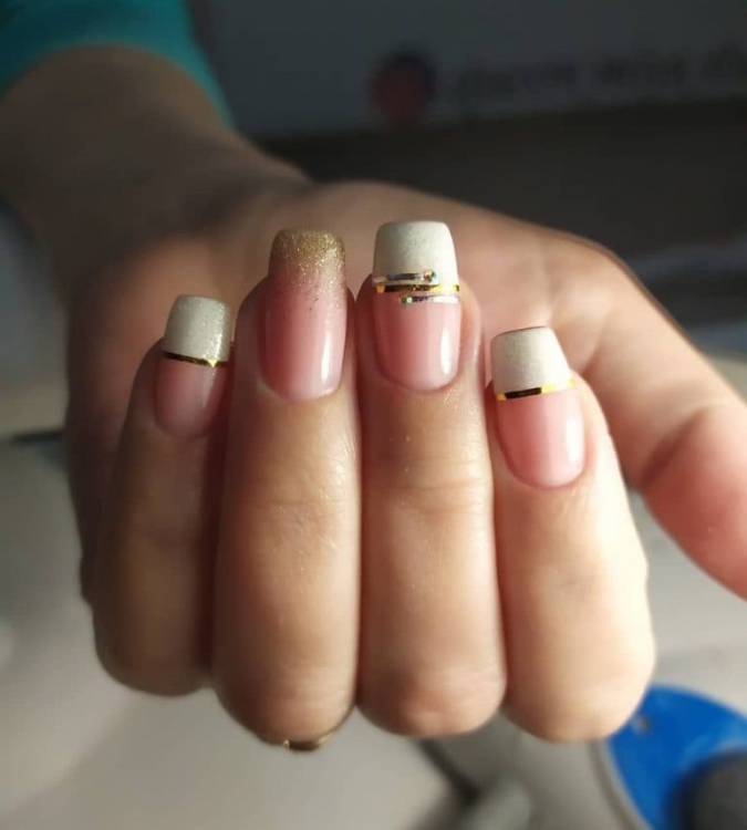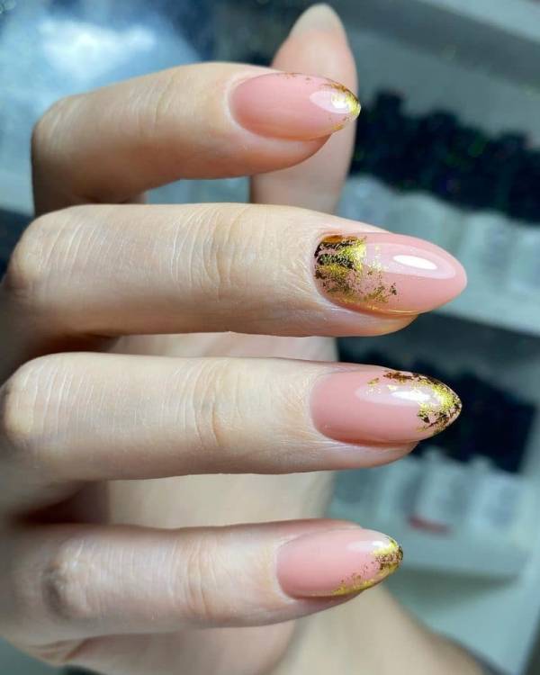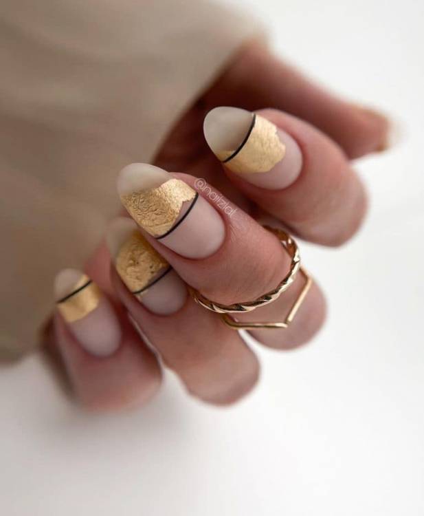Дуже гарний арт френч на нігтях нагадує пластівці поталі. Тут край нігтя прикрашений тонкою золотистою фольгою, що дуже незвичайно і стильно. Такий манікюр є ідеальним для вечірніх виходів.