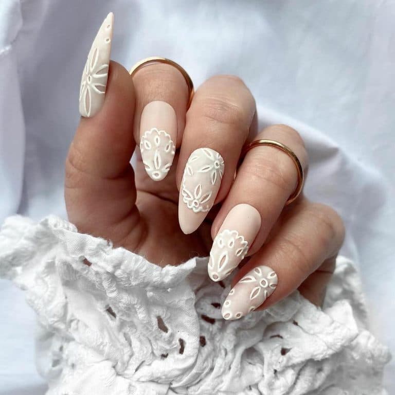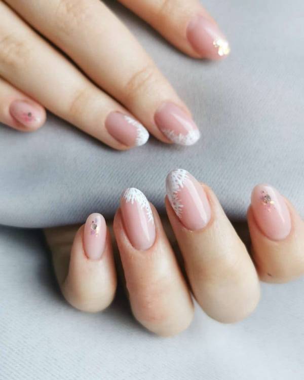 Ніжний френч – найкращий вибір для весільного манікюру. Сучасний ажурний френч на нігтях виглядає стримано та скромно, без розсипу стразів та багатоярусного ліплення. Вишукані візерунки білим лаком на рожевому або бежевому фоні підкреслять ніжність і красу нареченої.