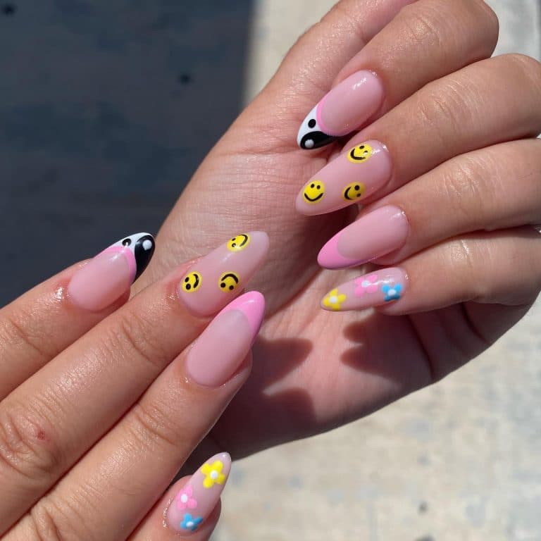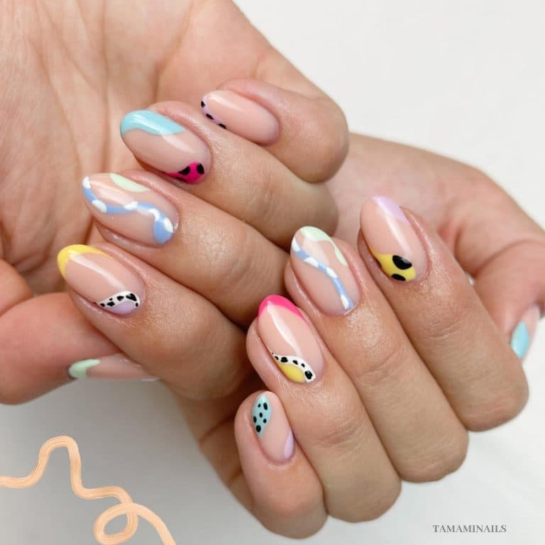 Френч-твіст передбачає яскраві абстрактні візерунки та їх переплетення. Тут нігті мають бути схожі на кольорові карамельки. Це ще один чудовий манікюр для літа.