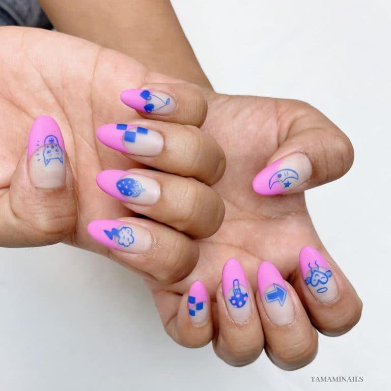 Наївні картинки на нігтях – модний нейл дизайн у стилі поп-арт. При цьому картинок не повинно бути занадто багато – достатньо прикрасити кілька нігтів, а для інших віддати перевагу френчу в компліментарному відтінку.