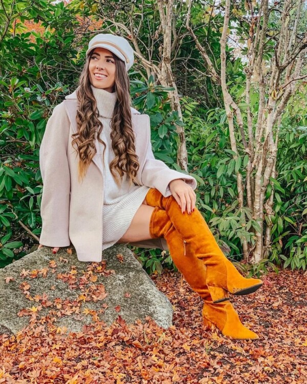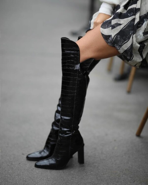 Модницям безумовно припадуть до смаку яскраві відтінки взуття. Яскраво-жовтий колір довгих чобітків чудово поєднується з укороченою чорною спідницею з шкіри. Такий лук буде залучати до себе погляди оточуючих.