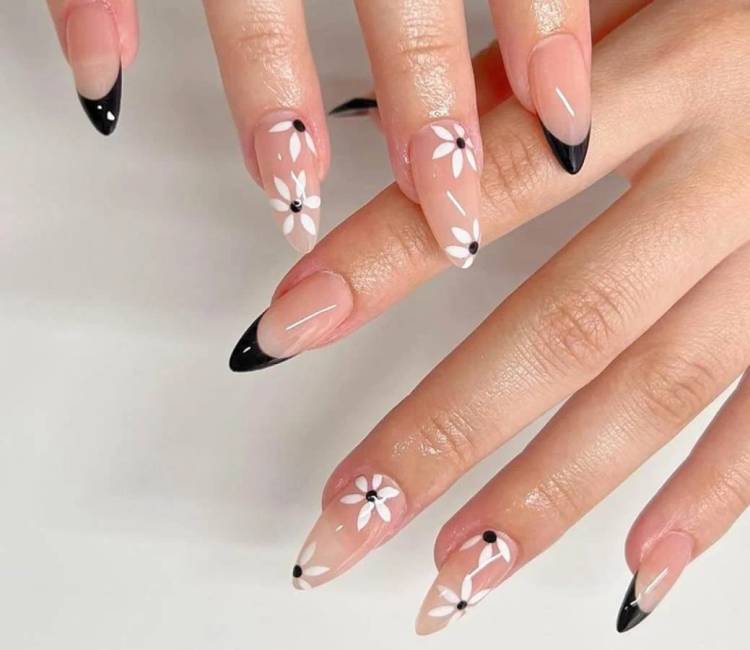 В рамках монохромної гами можна використовувати чорний і білий тони. Це простий, але стильний нейл дизайн на квіткову тему.
