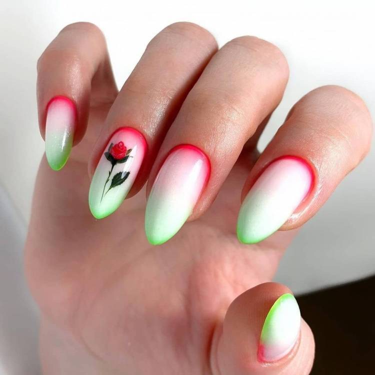 Колірна палітра може бути як стримано-нейтральною і однотонною в рамках одного манікюру, так і яскравою, барвистою – наприклад, кислотні та неонові відтінки, які дуже затребувані для літнього і відпускного манікюру.