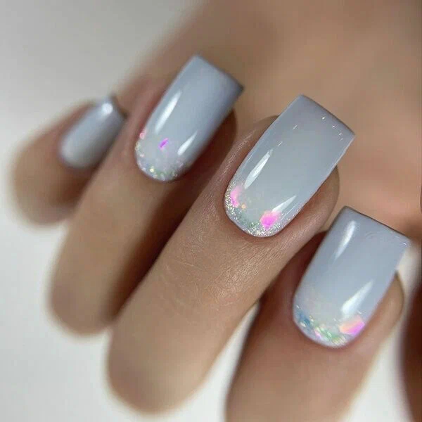 Можете додати крихту блиску біля кутикули, але це необов’язково. Чарівний сіро-молочний тон, правда, досить вибагливий до відтінку шкіри – перед нанесенням обов’язково попросіть майстра капнути крапельку лаку на ніготь і оцініть, як це виглядає саме на вас, при природному світлі.