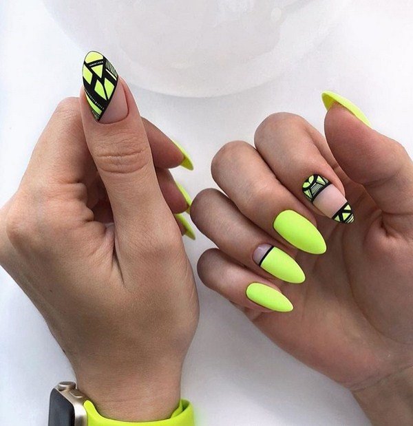 Тенденція прикрашати весняні нігті геометричним або абстрактним дизайном не нова, але у поєднанні з яскравими, неоновими гель-лаками ви отримаєте креативний і непересічний манікюр.