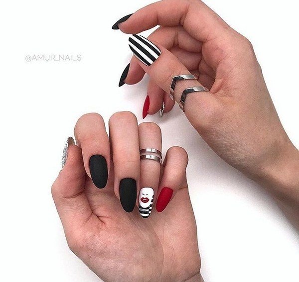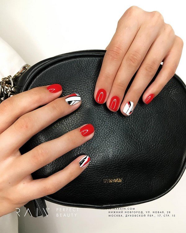 Приклад, що ви можете бачити на фото, демонструє дуже крутий манікюр у контрастному виконанні з чорним, червоним, білим гель-лаком, двоколірними смужками та незвичайним малюнком.