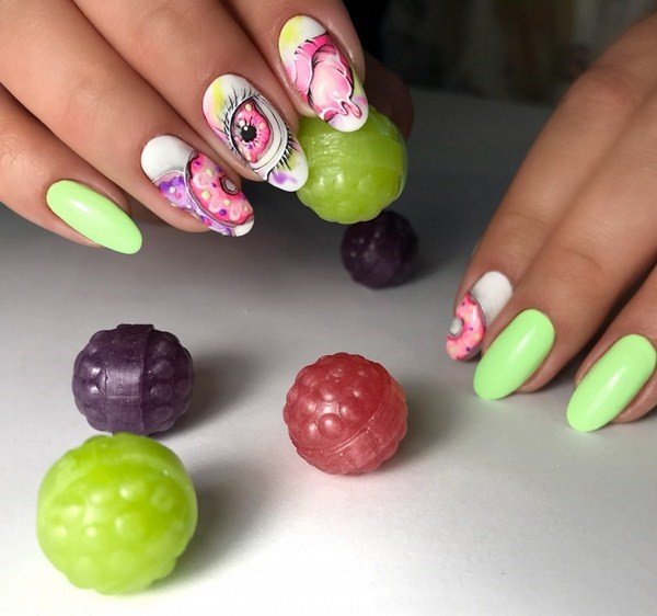 Наступне яскраве і нетривіальне оформлення — креативний манікюр у техніці, що передбачає створення різного дизайну для нігтів на кожній руці.