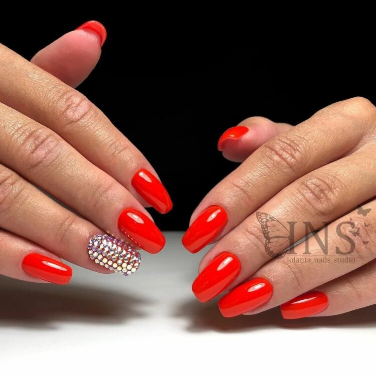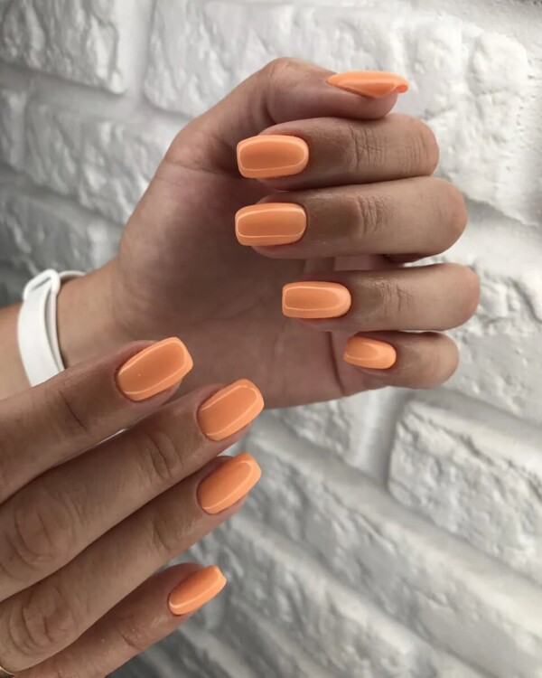 Як зробити гарний і стильний морквяний манікюр в 2021 році? Зверніть увагу на однотонне покриття. Воно прекрасно буде виглядати на коротких і довгих нігтях, з матовим або глянсовим топом. Розбавити дизайн ви можете модною фольгою, як золотою, так і срібною.