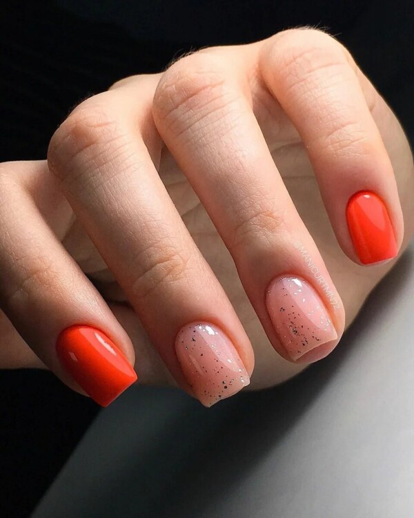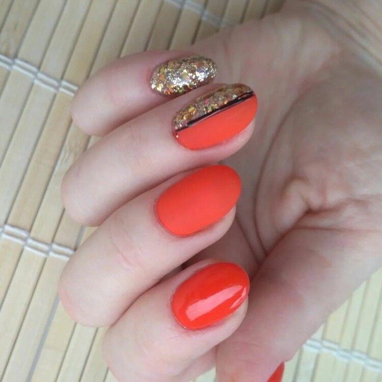 Також ви можете спробувати комбінацію – морквяного лаку і прозорого, на якому красуються лаконічні блискітки. Такий дизайн прекрасно підійде на кожен день.