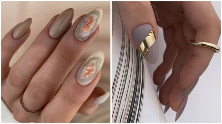 Осінній манікюр на мигдальні нігті – це лаконічний та стриманий дизайн. Однак, йому не чужі золоті візерунки осені, м’які та глибокі насичені відтінки палітри.