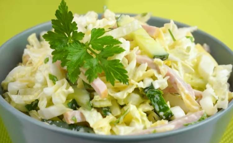 Пекінську капусту дрібно шаткуємо і перекладаємо у велику тарілку. Шинку нарізаємо соломкою. Сир натираємо на великій тертці. Свіжий огірок нарізаємо соломкою. Петрушку подрібнюємо.