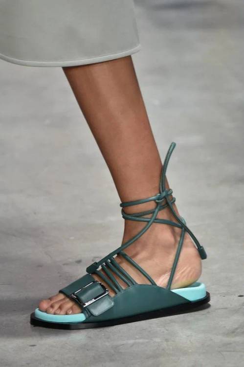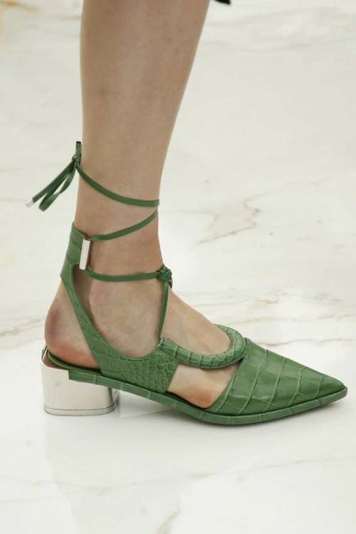 Взуття з довгими зав’язками буде актуальне в різних інтерпретаціях, починаючи від моделей на підборах і закінчуючи повсякденними шльопанцями на плоскому ходу.