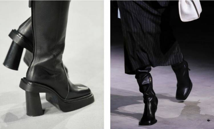 Наступний тренд з нашого списку – це елегантні високі чоботи з натуральної шкіри з незвичайним за формою каблуком.