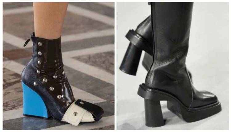 Наступний тренд з нашого списку – це елегантні високі чоботи з натуральної шкіри з незвичайним за формою каблуком.