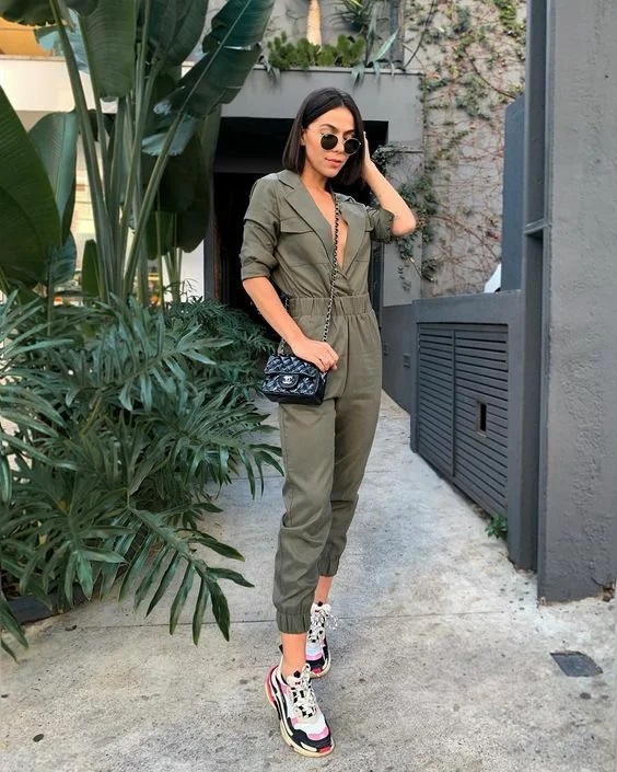 Комбінезон з акцентом на талії + білі масивні кросівки – відмінний варіант для повсякденного образу.