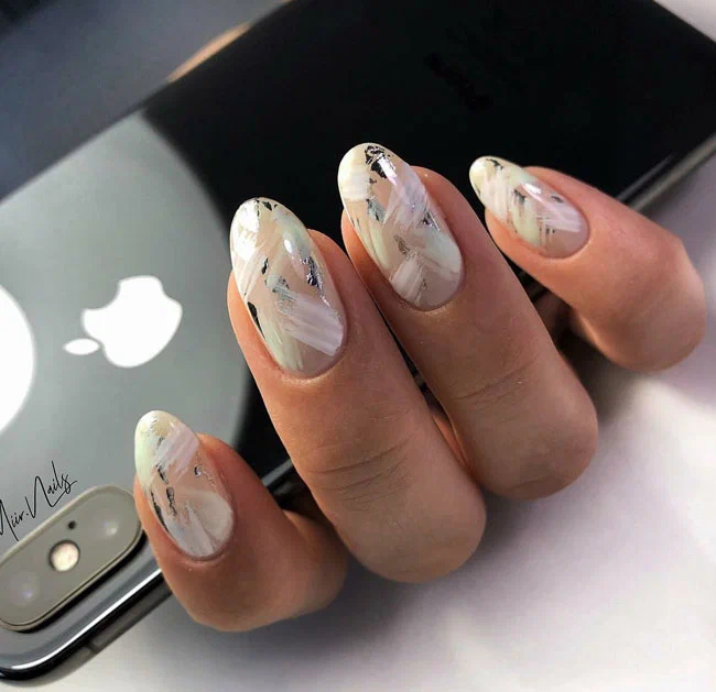 Коли сильно набридли чіткі лінії та правильні форми, можна зробити манікюр із абстрактним дизайном. Наприклад, ось такий з використанням світлих відтінків лаку та фольги.