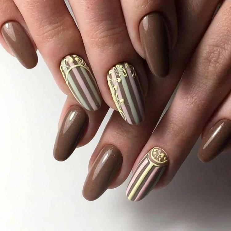Коричневий манікюр теж може виглядати дуже оригінально та зовсім ненудно. Наприклад, якщо скомбінувати в одному дизайні геометричні та рослинні мотиви.