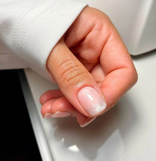 Якщо хочете зробити строгий, але не звичайнісінький манікюр, подивіться на цей варіант. Начебто б класичний френч, але замість чіткої посмішки на відрослі кінчики нігтів нанесений сріблясто-білого кольору з ефектом омбре.