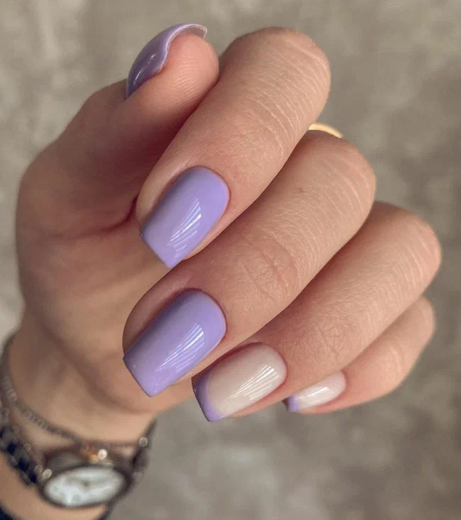 Якщо ви не можете вирішити, чи зробити однотонне покриття або вибрати френч, можна не ламати голову, а поєднати обидва дизайни в одному. У прикладі на трьох пальцях зроблено однотонне покриття бузковим лаком, а на 4 і 5 френч, в якому основний колір – нюд, а «усмішка» намальована бузковим лаком.