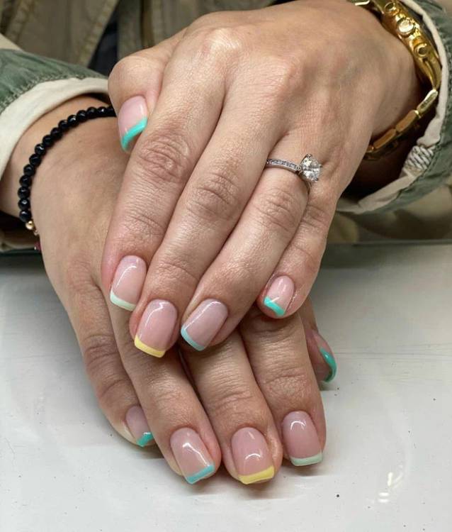 Якщо ви шанувальниця френча, але хочете спробувати щось нове, подивіться на цей варіант. У цьому манікюрі використано кілька лаків пастельних тонів – жовтий, бірюзовий, блакитний, білий.