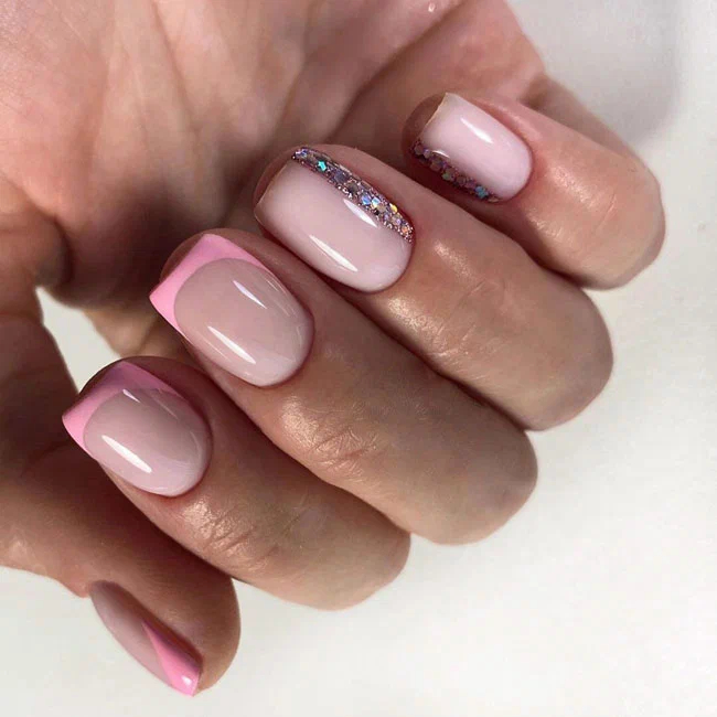Ще один незвичайний варіант френча з використанням ніжно-рожевого лаку для додаткового декору використані стрази та блискітки на четвертому та п’ятому пальці.