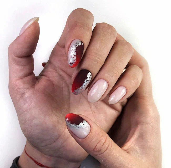 Ефектний манікюр, у якому поєднується однотонне нюдове покриття та яскраве оформлення з використанням фольги. Виглядає дуже ефектно і при цьому досить стримано.