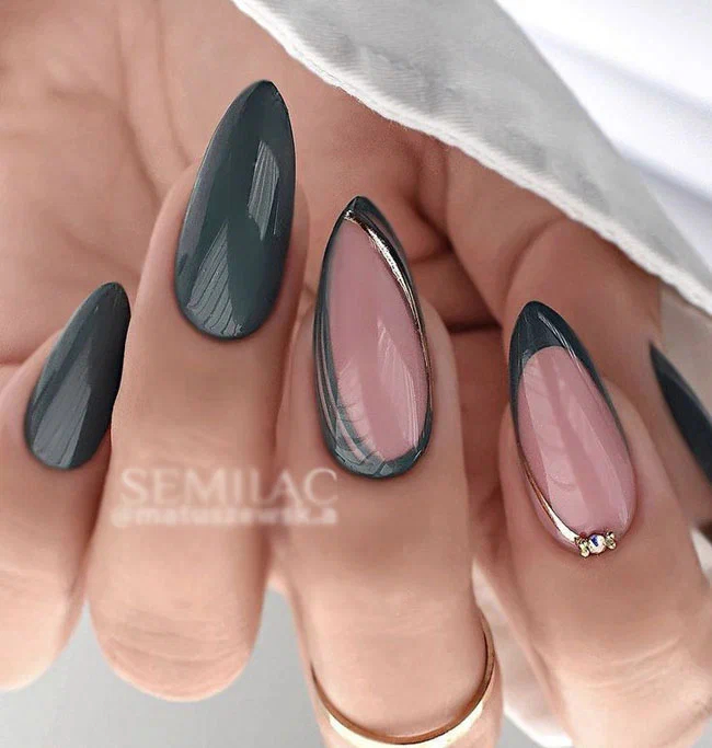 Поєднання нюдового і кольорового лаку можливе в різних комбінаціях. Наприклад, такий варіант з використання сірувато-зеленого лаку. Додавання тонких золотих смужок та мініатюрних стразів робить цей дизайн ще ефектнішим.