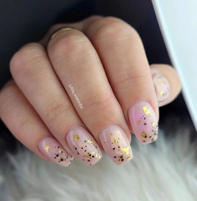 Нюдовий манікюр з використанням фольги та темних цяток – оригінальний варіант дизайну.