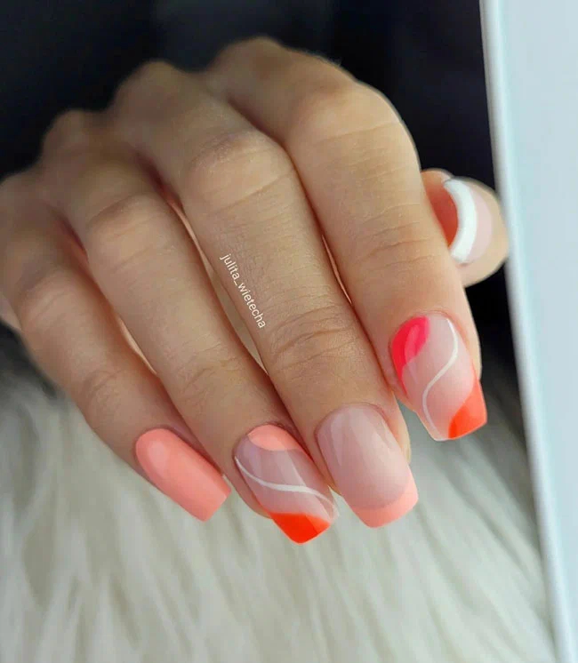 Іноді дуже хочеться використати яскраві, навіть кислотні варіанти лаку. Але манікюр у кислотних тонах може наголосити на сухості та інших вікових змінах шкіри на руках. Але якщо основний тон нюдовий, додавання яскравих акцентів виглядатиме гармонійно. Манікюр буде яскравим, але непомітним.