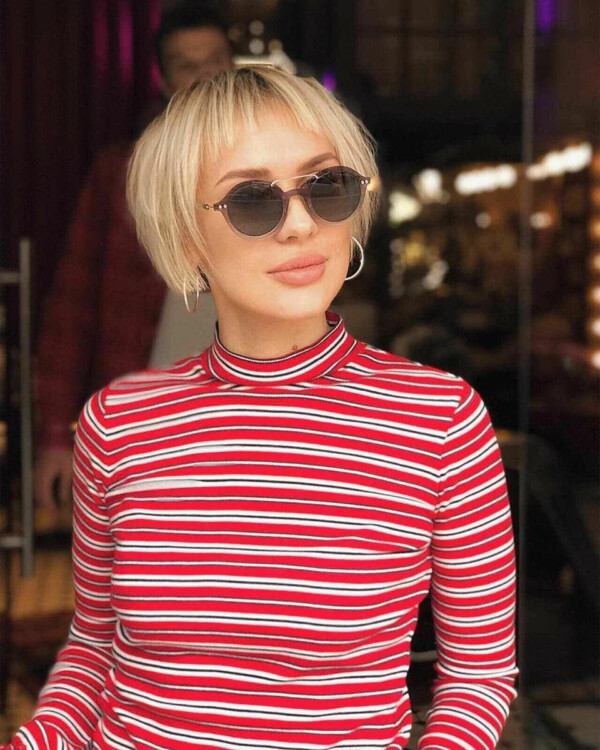 Мабуть, це найкращий варіант недбалого Пікс з косим чубчиком. Виглядає шикарно на тонкому волоссі і не вимагає великого часу на укладку.