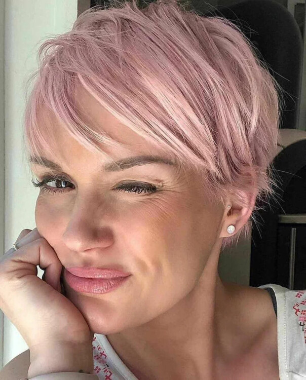 Рожевий блонд + Пікс – це завжди виграшна зачіска! Косий короткий чубчик обов’язково має бути присутнім в цьому образі.