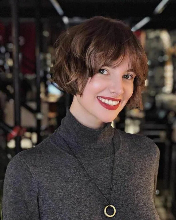 Хочете коротку стрижку, але не занадто? Вам сподобається цей варіант! Середнє Пікс на хвилястому волоссі і короткий чубчик – завіса, довжиною трохи нижче брів. Виглядає юно і свіжо!