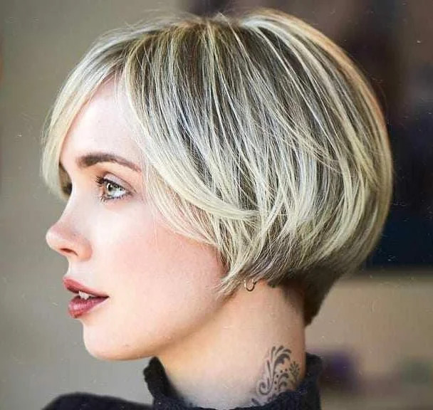 Подивіться як стрижка може перетворити і змінити риси обличчя в кращу сторону! Багатошаровий боб добре підходить тонкому волоссю, а косий короткий чубчик приховує високе чоло.