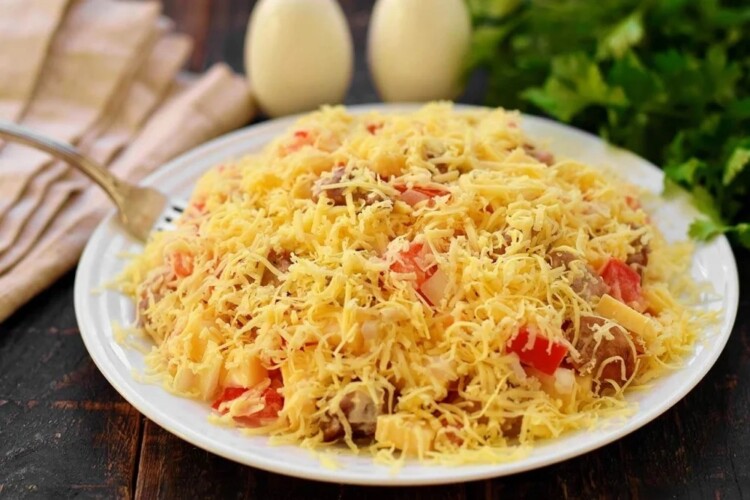 Готуємо салат Французький поцілунок, який володіє особливим шармом, не тільки в назві, але і в смаку. Салат є досить популярним, його часто готують на святкові обіди і не тільки. Компоненти мають ідеальне поєднання смаку, для пікантності додаємо мариновану цибулю. В якості м’ясного інгредієнта за класичним рецептом беремо свинину чи яловичину, для більш легкого варіанта можна використовувати курку. М’ясо обов’язково смажимо до придбання рум’яної скоринки. Також цей салат має традиційну подачу – суміш викладається на плоске блюдо, посипається сирною стружкою.