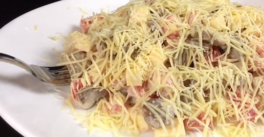 Інгредієнти прості, доступні. Цибулю обов’язково замаринувати, інакше ніжність буде вже не та! Салат можна приготувати і до недільної вечері, і на святковий стіл! Закуска дивовижна: ніжна, з легким вершковим ароматом, в міру пікантна – справжній шедевр.