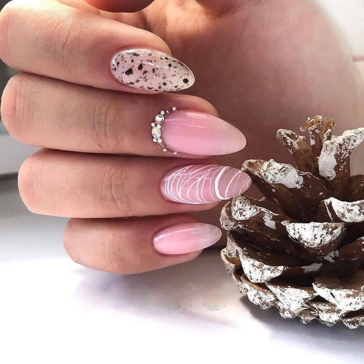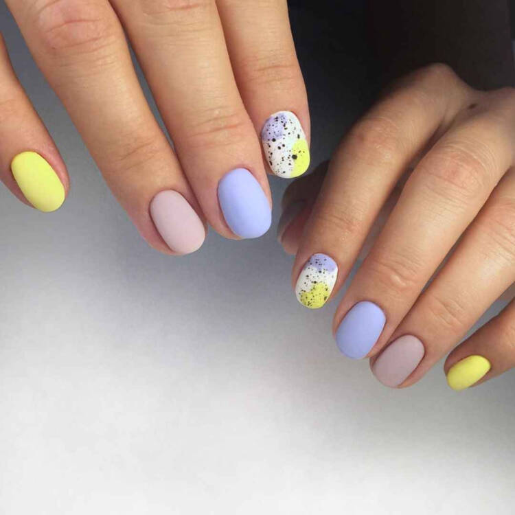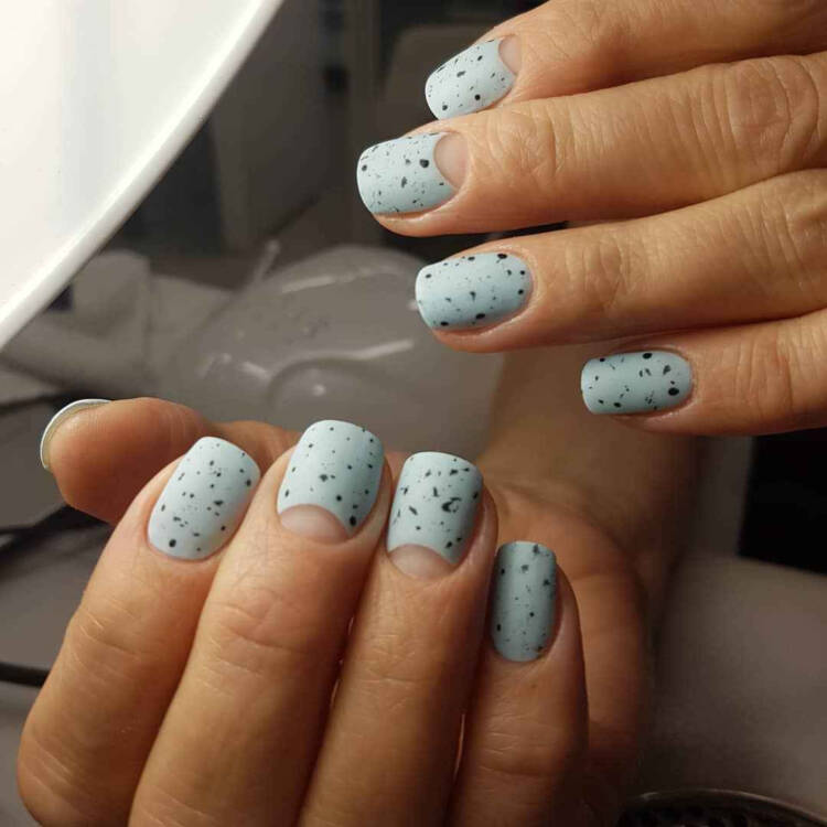 Манікюр з ефектом перепелиних яєць виглядає дуже ніжно і акуратно. За основу в такому манікюрі зазвичай беруть м’які, нейтральні відтінки, щоб цятки добре виглядали на контрасті. Це варіант для будь-якої довжини нігтів і добре буде виглядати на будь-якій формі.