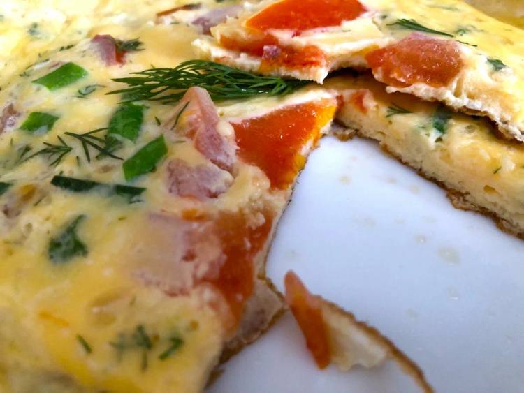 Яєчня готова, викладаю її на тарілку, за бажання можна посипати зеленню або сиром, якщо ви його не додавали в процесі приготування.