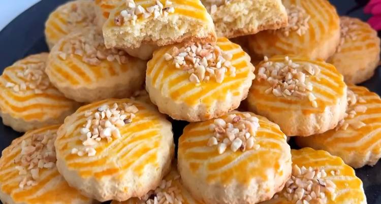 Викладаємо кружечки на лист, вистелений пергаментним папером. Змащуємо печиво збитим жовтком і зверху викладаємо подрібнені волоські горіхи або мигдаль. Відправляю в розігріту до 180 градусів духовку – на 15-20 хвилин.