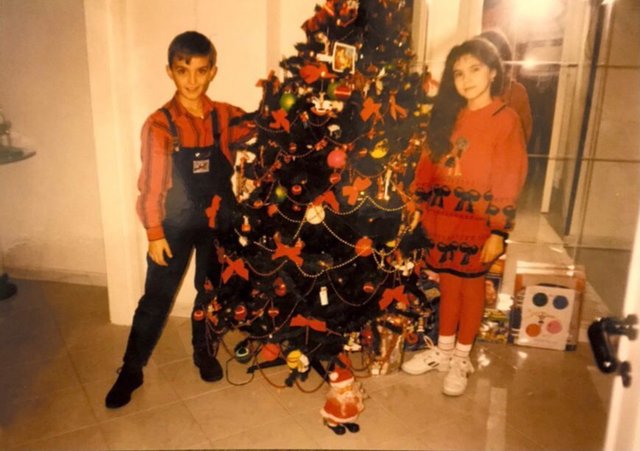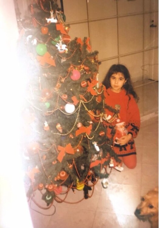 На новорічних кадрах, біля пишно вбраної ялинки, Каменських у милій червоній сукні позувала зі своїм другом дитинства.