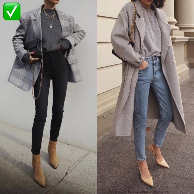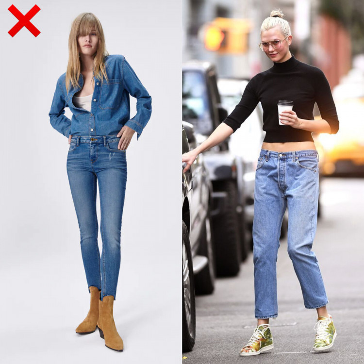 Дуже часто джинси-скінні збираються в гармошку і мають неправильну довжину, що знову ж таки псує образ. Якщо ви все-таки дуже любите обтислі джинси, то поєднуйте їх з об’ємним верхом (піджаки, светри, футболки вільного крою), який врівноважить образ.