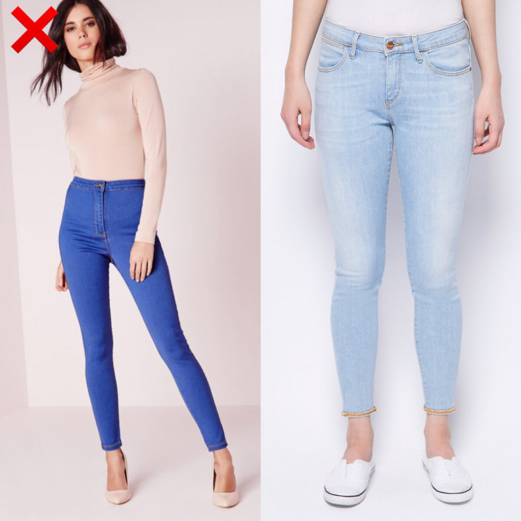 Джинси з низькою посадкою не прикрашають жодної фігури. Мало того, що такі джинси відкривають живіт і подовжують талію, але вони візуально вкорочують ноги. Тому не варто вестись на всі модні тренди. Віддавайте перевагу джинсам із високою або середньою посадкою, які будуть актуальні завжди.