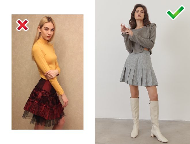 Довжина міні дуже актуальна. Але це не означає, що спідничка з рюшами вписується в цей тренд. Замінюємо це непорозуміння короткою моделлю в складку з костюмної тканини.