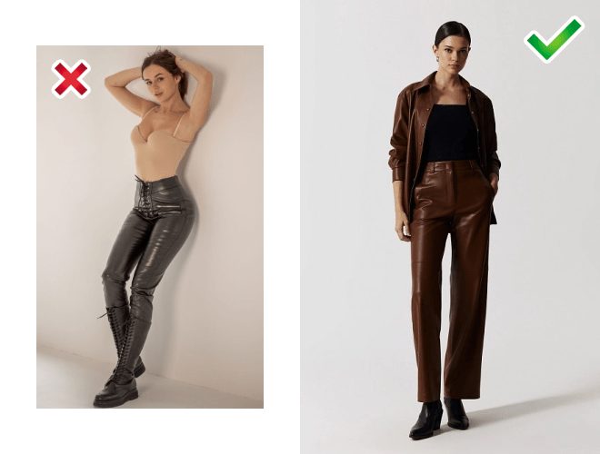 Облягаючі шкіряні штани зі шнурівкою, може, і гарні для веселих вечірок, але точно не підходять для складання буденних образів. Сучасно та елегантно виглядають прямі штани з екошкіри. Якщо в чорному виконанні вони здаються надто нудними, приміряйте їх у трендовому шоколадному відтінку.