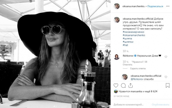 Зазначимо, відреагував на публікацію король російського шоу-бізнесу Філіп Кіркоров, захопившись красою українки. «Нереальна Діва!», – написав він. «Доброго Дня, Оксано! Ві дуже чарівна і приваблива», «Доброго ранку, Оксаночка!!! Літній образ – в десятку», «Ві дуже стильно. Приємного Вам відпочинку», «А Вам дуже круто в капелюхах», «Розкішна жінка! Просто захоплююся вами. Тієї випадок, коли і зовнішність, і внутрішній світ у гармонії. У вас все чудово», «Дуже гарний образ», «Ві нереальна красуня», «Оксаночка, Вам можна і не писати тут нічого під вашими фото – досить подивитися на вас і наповненість наших думок і роздумів про світ, буття і прекрасного в одну мить спливають в думках! Спасибі Вам і вашому чоловікові за правильний життєвий шлях, доброту душі і добросердя! Це відчувається, дивлячись на вас! Ще раз спасибі! Нехай Всесвіт «чує» вас і допомагає! Особливо чоловікові в його важкому правоборстве на терені країни!», – відзначилися коментарями передплатники Оксани Марченко.