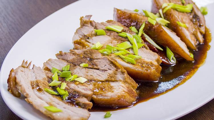 Сковороду накриваємо фольгою (або кришкою) та на невеликому вогні тушкуємо 80 хвилин. На тарілку викладаємо овочі та нарізану скибочками апетитну грудинку. М’ясо поливаємо соусом, що залишився в сковороді, прикрашаємо зеленою цибулькою і подаємо до столу. Смачного!