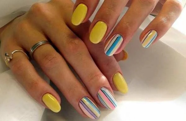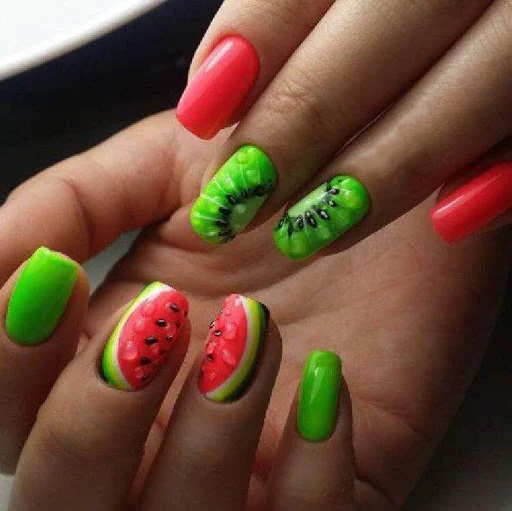 - Якщо ви – натура творча, поекспериментуйте з конкретним кислотним кольором покриття: дозвольте одному-двом нігтиками вибитися із загальної картини оригінальним малюнком «в тему». Подумайте, з чим у вас асоціюється відтінок: наприклад, жовтий – з часточкою лимона, рожевий – з скибочкою кавуна, бузковий – з прекрасною однотонною квіткою і т.п. Цей образ і покажіть на поверхні нігтьових пластин (припустимо, тільки великого пальця або ж вказівного і середнього). Повірте, такий нейл-арт буде виглядати неймовірно свіжо і незвично.
