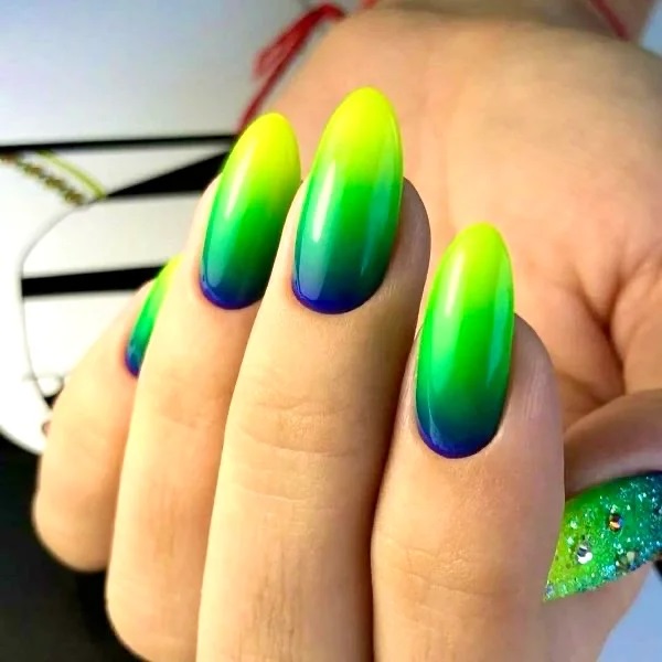 - Неоновий градієнт. Неординарний нейл-арт у формі плавно переходять один в одного кислотних відтінків. Причому останні можуть бути як витриманими в одній колірній гамі (наприклад, кілька тонів зеленого), так і контрастними (скажімо, початковим виступає жовтий, а завершальним – синій).
