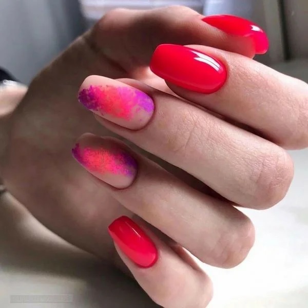 - Неоновий дим. Чудова новинка і абсолютний хіт сезону. Даний дизайн являє собою манікюр з кислотними втірками, які покривають матовий фон жіночих нігтів у вигляді димки. До речі, тут досить доречно застосування згаданої вище техніки градієнт.